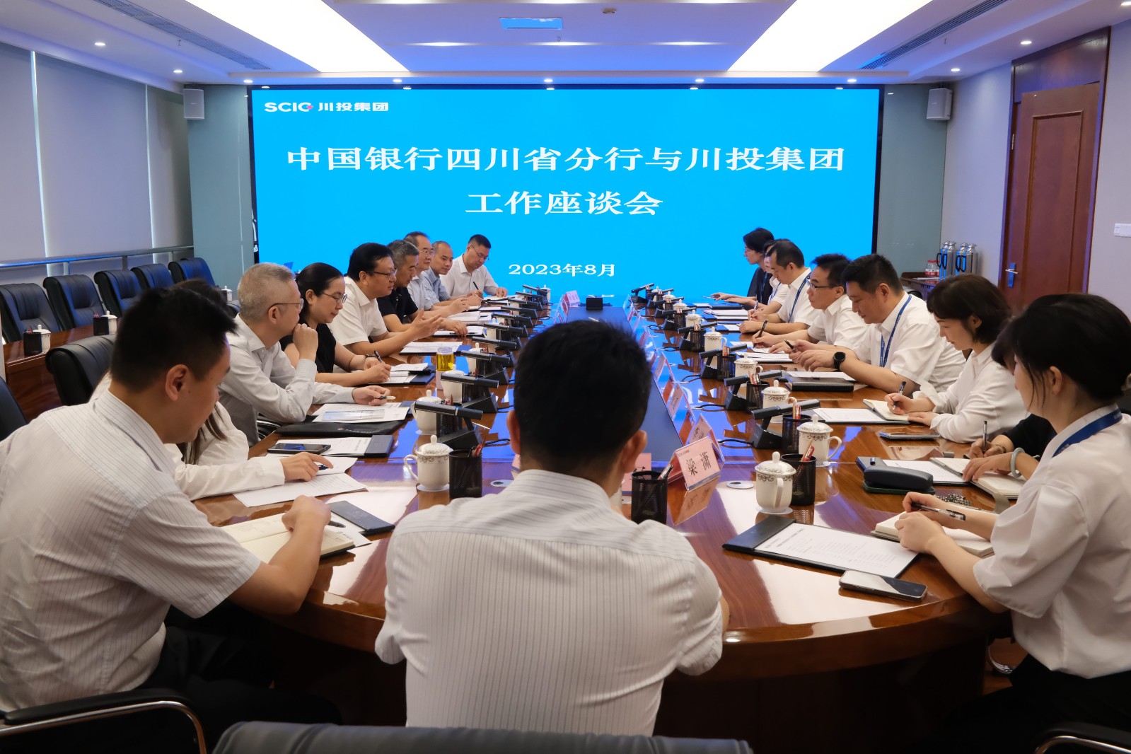 8月18日,中国银行四川省分行(以下简称“中行四川分行”)党委书记、行长王果,副行长侯建国一行率队到访川投集团,并就相关工作进行座谈。集团公司党委书记、董事长吴晓曦,财务总监黄劲出席座谈。