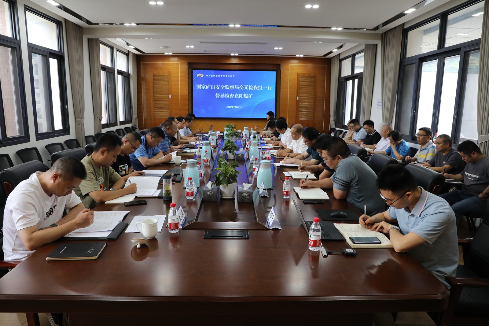 检查组一行实地察看了嘉阳煤矿采煤二队智能化操作室、调度中心、安培中心,详细了解了薄煤层智能化综采生产流程、平台远程控制操作、透明矿山和“智改数转”建设情况,检查组成员与嘉阳煤矿相关专业负责人对接,系统检查了治本攻坚三年行动、八项硬措施落实、执法监管监察、隐患排查治理及风险分析与台账管理、隐患整改、雨季“三防”及防治水等软件资料。