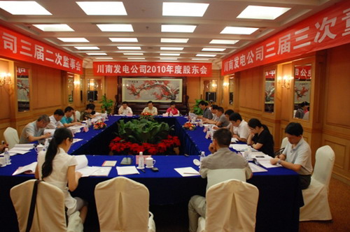 6月12日,川南发电公司2011年度“三会”(股东会、董事会、监事会)在成都召开。会议由川投集团公司副总经理、川南发电公司董事伍康定(受郭勇董事长委托,代行董事长职责)主持。川南发电公司董事郭爱国、张维群、肖群英、李胜章、唐得旗,监事会主席任明霞,监事郑世红、宋咏梅参加会议。川南发电公司相关管理人员谭先明、谢伟平、邱涛、黄松、刘云戈等列席会议。