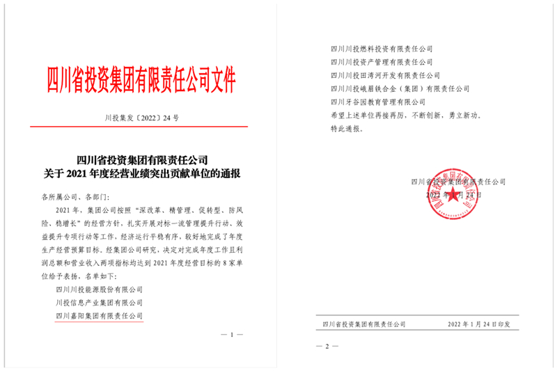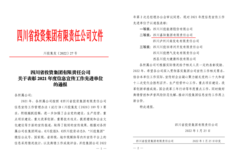 硕果累累,喜讯连连。1月25日,川投集团召开2022年度工作会,会议表彰了2021年度经营业绩突出贡献单位和信息宣传工作先进单位,嘉阳集团公司喜获两项荣誉。