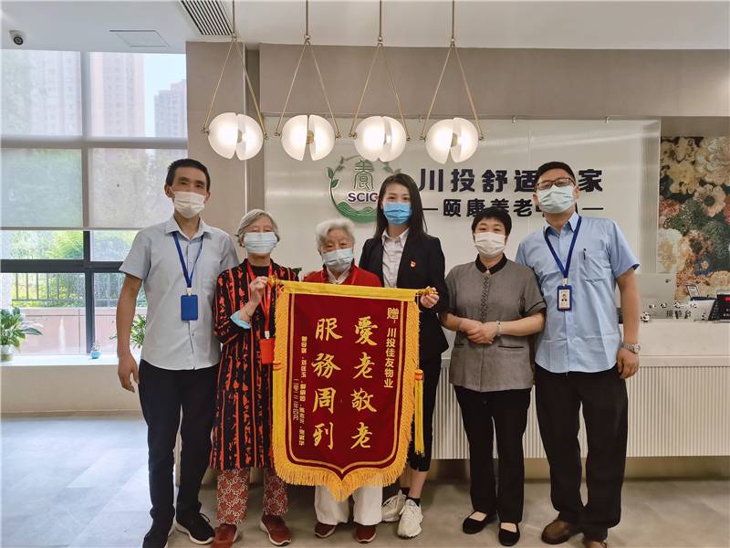 2022年5月20日,川投舒适之家•颐康养老中心四位长者代表给川投佳友物业颐康养老物业服务中心送来了写有“爱老敬老,服务周到”的锦旗。一面锦旗,一句感谢是对物业人的鼓舞,是养老院长者对物业工作的肯定,更是与业主深厚情谊的见证。