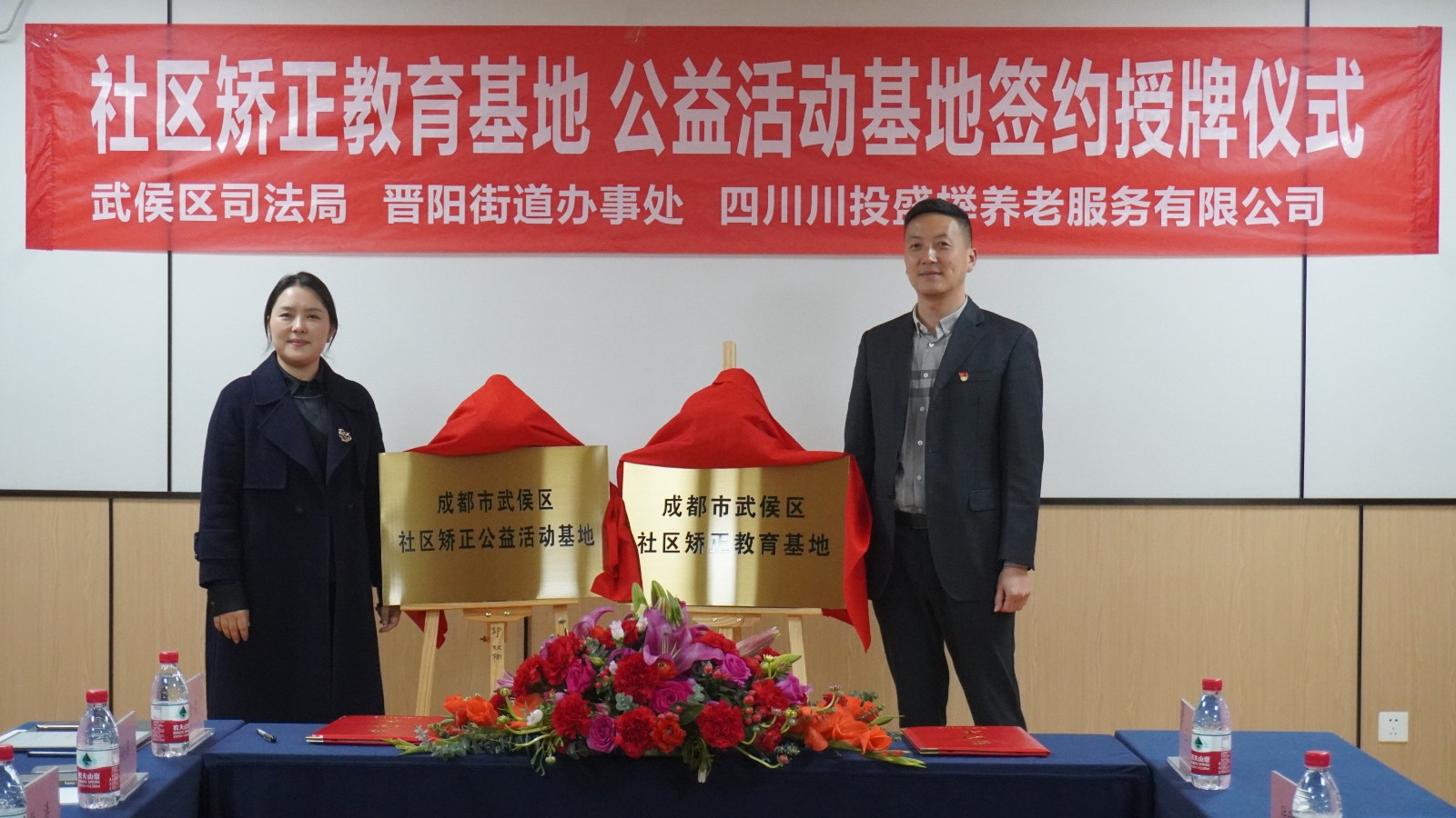3月12日,川投盛榉公司与武侯区司法局、晋阳街道办事处举行社区矫正教育基地(公益活动基地)签约授牌仪式。武侯区司法局党组书记张竹,晋阳街道办事处党工委书记龚婧,川投盛榉公司党支部书记、执行董事、总经理杨飞出席仪式。