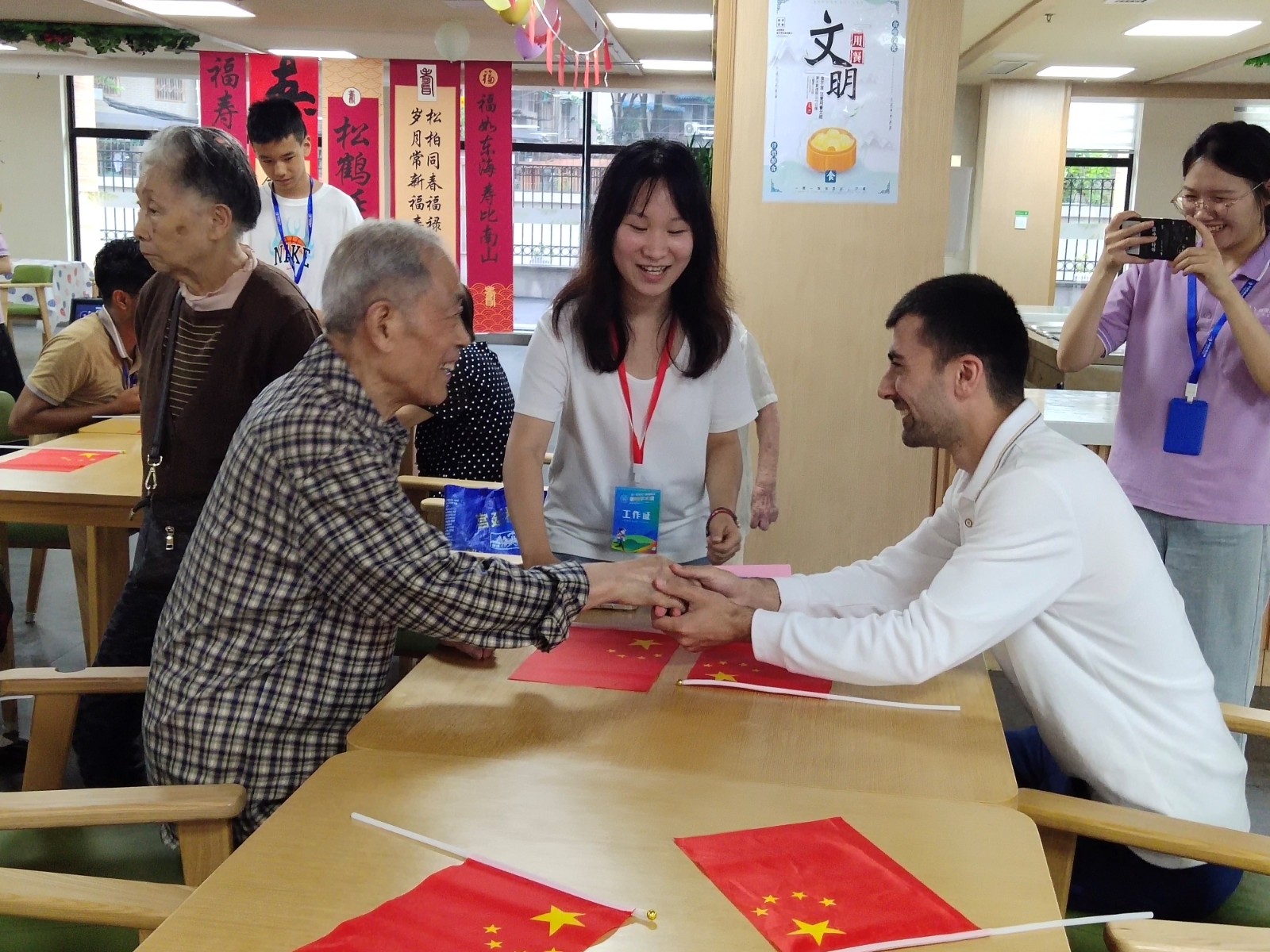 活动中,留学生们纷纷上台,用所学中文作了自我介绍,并与长者们结对进行破冰游戏、非遗剪纸活动;长者们也以满腔的热血,用演唱歌曲等方式对留学生的到来表示欢迎。语言不同,幸福共通;国籍有别,友谊长存。