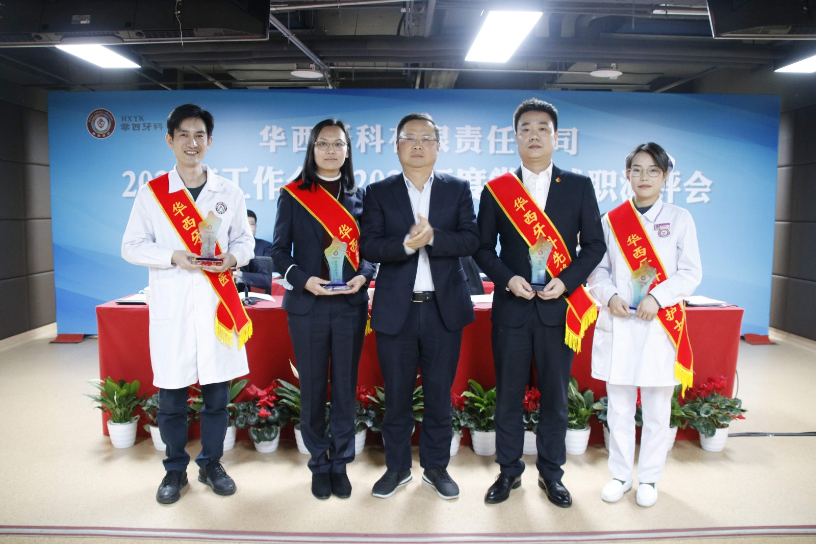 集团公司党委组织部副部长郑雄出席会议。华西牙科本部全体员工、各子公司党总支(党支部)书记、班子成员、华西牙科党员代表以及受表彰的先进个人现场参会,各子公司中层副职以上人员通过视频方式参加会议。